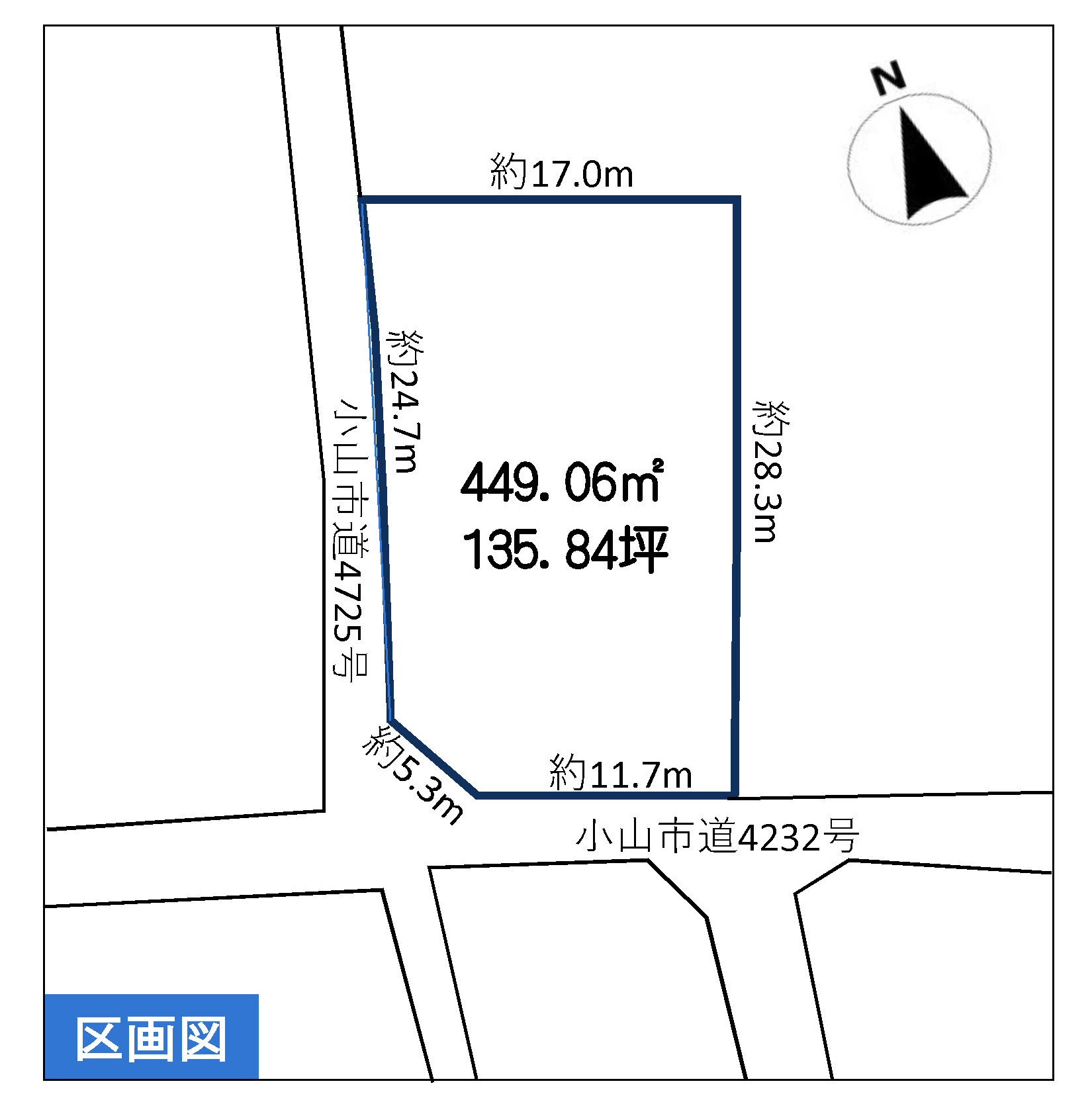 - 南道路(市道)幅員約5m、西道路(市道)幅員約6.5m